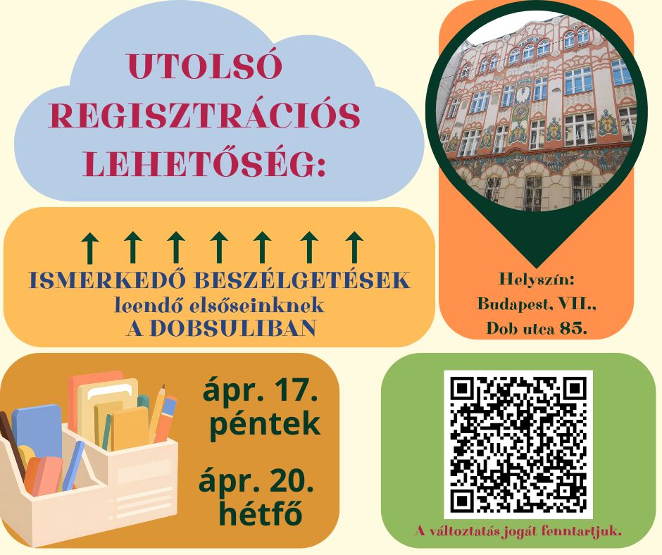 Ha még nem regisztráltak iskolánkban az ismerkedő beszélgetésre, akkor feltétlenül várjuk Önöket és gyermeküket az utolsó alkalmainkra.